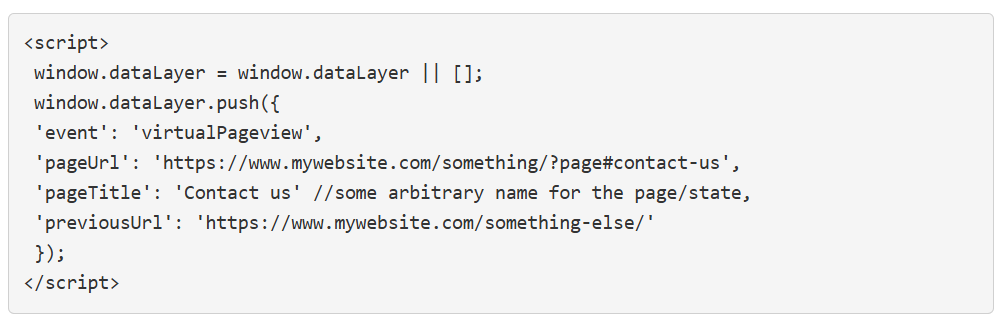 هر وقت کاربر به یه بخش خاص از صفحهت بره، توسعهدهنده باید این تکه کوچیک کد جاوااسکریپت رو فعال کنه. این نشون میده یه "virtual Pageview" اتفاق افتاده و URL جدید هست.